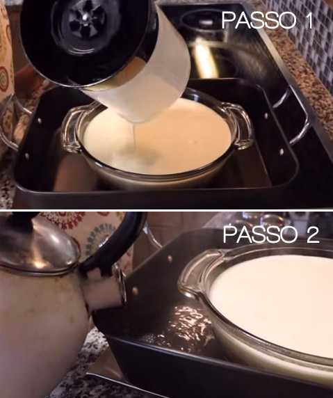 Coloque outra forma maior com água, abaixo da forma do pudim